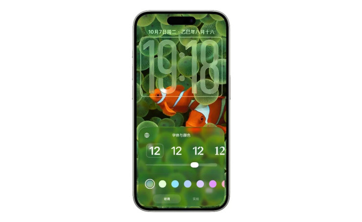 还有锁屏界面,调整时间字体与颜色的自定义菜单,现在也获得了液态玻璃背景。